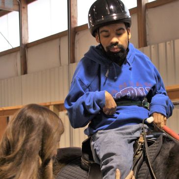 When Miles first started riding, he was all about the GO. He wanted to get on and get moving! As he's developed a partnership with his horse, he has started to think about consequences. What happens if you don't steer? You run into things. This improvement in his understanding of cause and effect has spilled over into the rest of Miles' life. He is thinking about what he's doing but also considering the next step and how to get through his activities.
